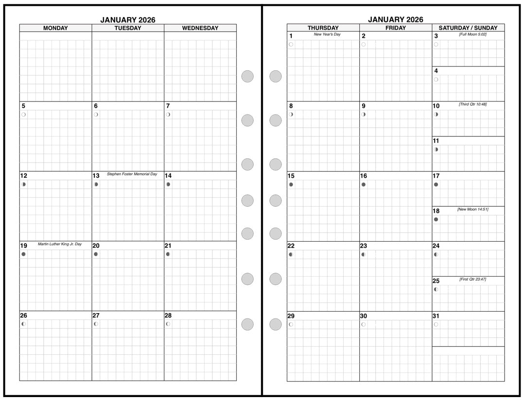 This is a weekly & monthly planner insert for the popular Franklin Classic size notebooks.. Page is half-letter size, 5-1/2in x 8-1/2in. Choose the week start day as Sunday or Monday. Each week is a 2-page spread. The first 5 days of the week on the left, the last 2 on the right. On the right there are sections for a weekly To-Do list and notes.