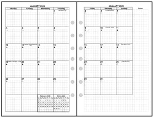 This is a weekly & monthly planner insert for the popular Franklin Classic size notebooks.. Page is half-letter size, 5-1/2in x 8-1/2in. Choose the week start day as Sunday or Monday. Each week is a 2-page spread. The days of the week are on the left. The first 6 days of the week are arranged in 2 columns, 3 days on the left and 3 on the right. The 7th day spans across the bottom. On the right is a note page which includes mini-reference monthly calendars showing the previous, current, and following months.