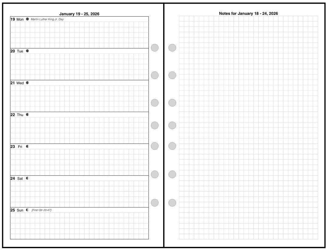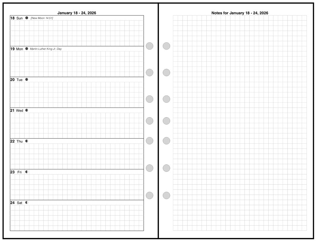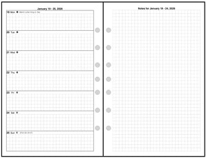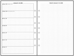 This is a weekly & monthly planner insert for the popular Franklin Classic size notebooks.. Page is half-letter size, 5-1/2in x 8-1/2in. Choose the week start day as Sunday or Monday. Each week is a 2-page spread. The days of the week on the left. On the right is a page for notes.