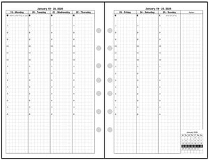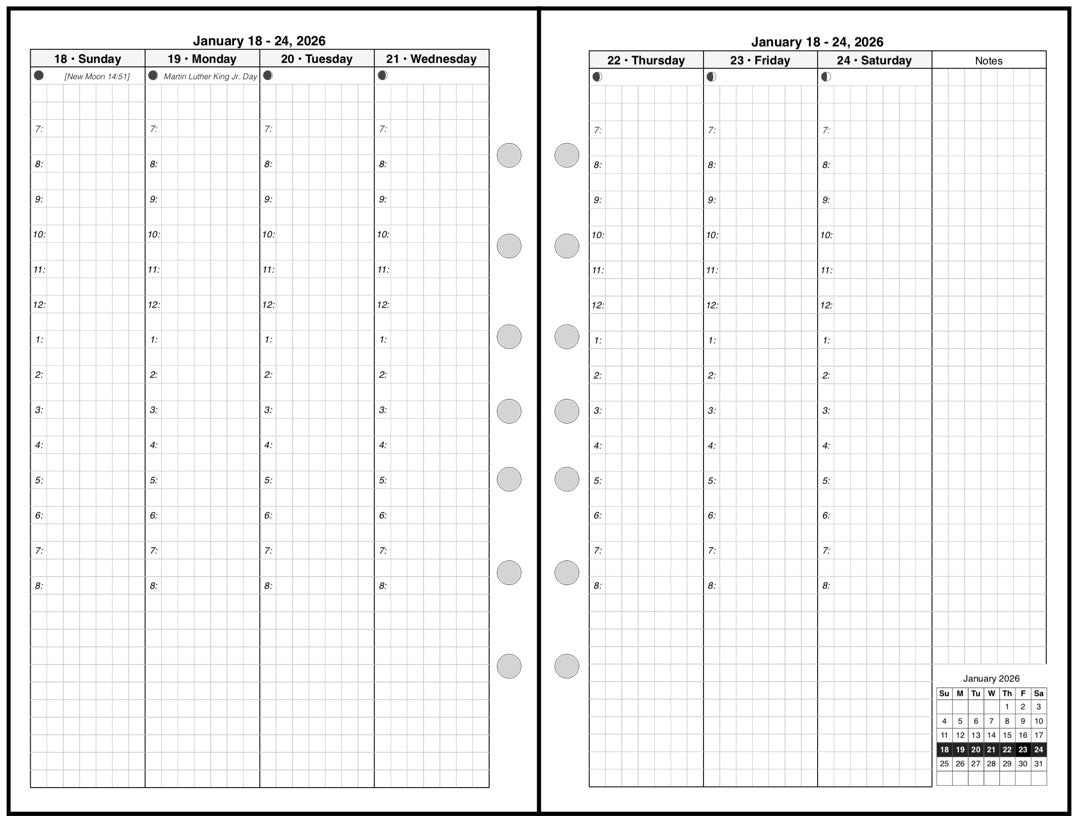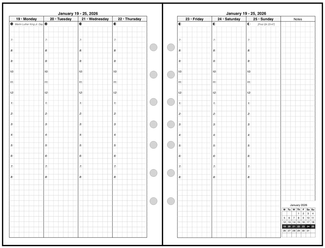 This is a weekly & monthly planner insert for the popular Franklin Classic size notebooks.. Page is half-letter size, 5-1/2in x 8-1/2in. Choose the week start day as Sunday or Monday. Each day of the week is a vertical column. The first 4 days of the week are on the left, and the last 3 are on the right. The right-hand column is lined for notes. Time slots are printed for 7:00 AM through 7:00 PM on each day. There is a mini reference calendar for the current month at the bottom of the notes column.