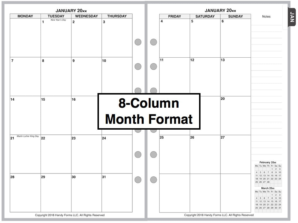 This is a monthly planner insert for the popular Franklin Classic size notebooks. Page is half-letter size, 5-1/2in x 8-1/2in. The week starts with Sunday or Monday. Each month is a 2-page spread, with a lined note page before and after. The days are arranged according to the style (see below). There are no lines printed in the daily blocks. For 6-column and 8-column styles, if the 30th and/or the 31st would fall below the bottom row, these dates are moved to the first 2 daily blocks in the first row.