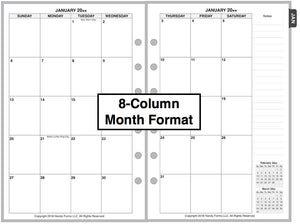 8-Column style: Available with Sunday or Monday start. The first 4 days of the week are on the left-hand page, and the last 3 days are on the right. A lined area for notes is printed in the right-hand column.