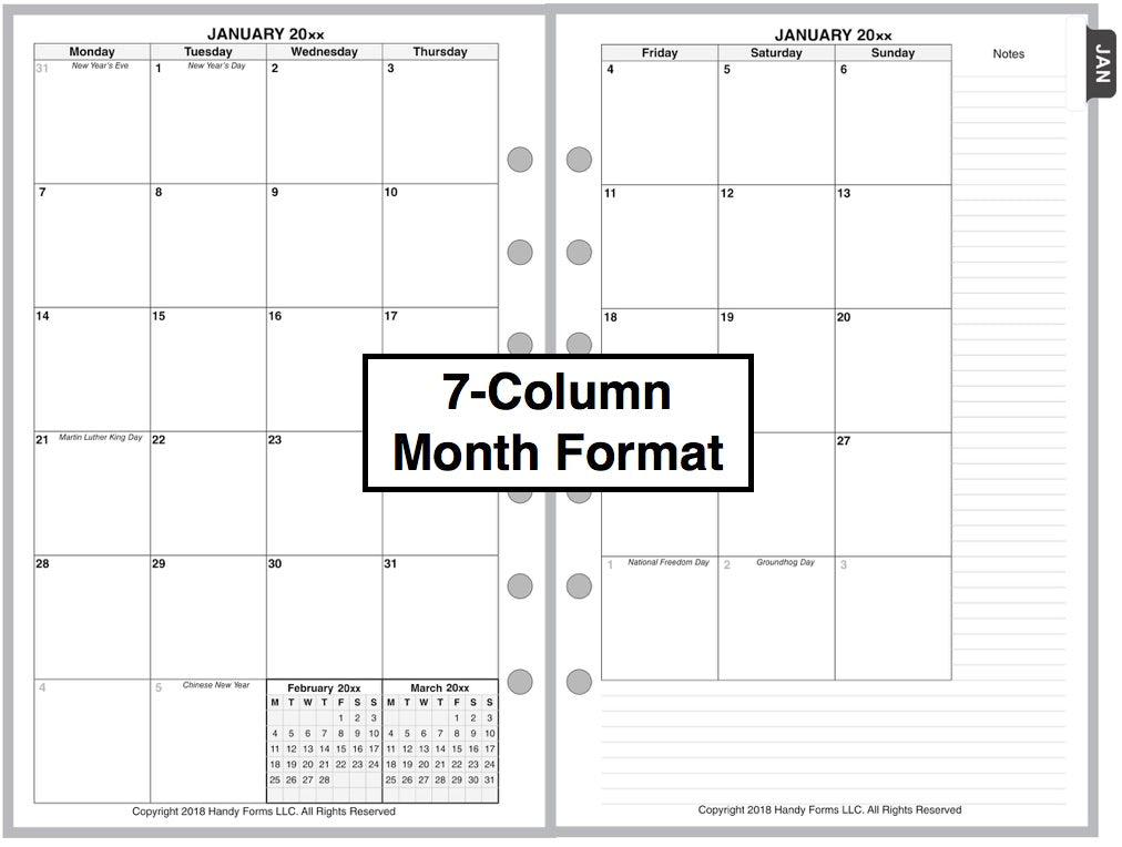 7-Column style: Available with Sunday or Monday start. The first 4 days of the week are on the left-hand page, and the last 3 days are on the right. A lined area for notes is printed in the right-hand column and below the last row on the right. Mini reference calendars are included for the 2 following months.