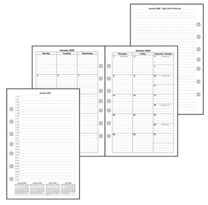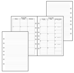This is a monthly planner insert for Classic (Half-Letter) size notebooks. Page size is Classic Half-Letter, 5½" x 8½" (140mm x 216mm). The week starts with Monday. Each month is a 2-page spread. Monday-Tuesday-Wednesday are on the left-hand page, and Thursday-Friday-Saturday/Sunday are on the right. Saturday and Sunday share the right-hand column. Lines are printed in the daily blocks. This is a 5 week monthly layout, so occasionally the 30th and/or the 31st would fall below the bottom row. When this happens, these dates can be either moved to the first 2 daily blocks in the first row, or these overflow days can be printed in the Monday-Tuesday blocks in the 5th week.