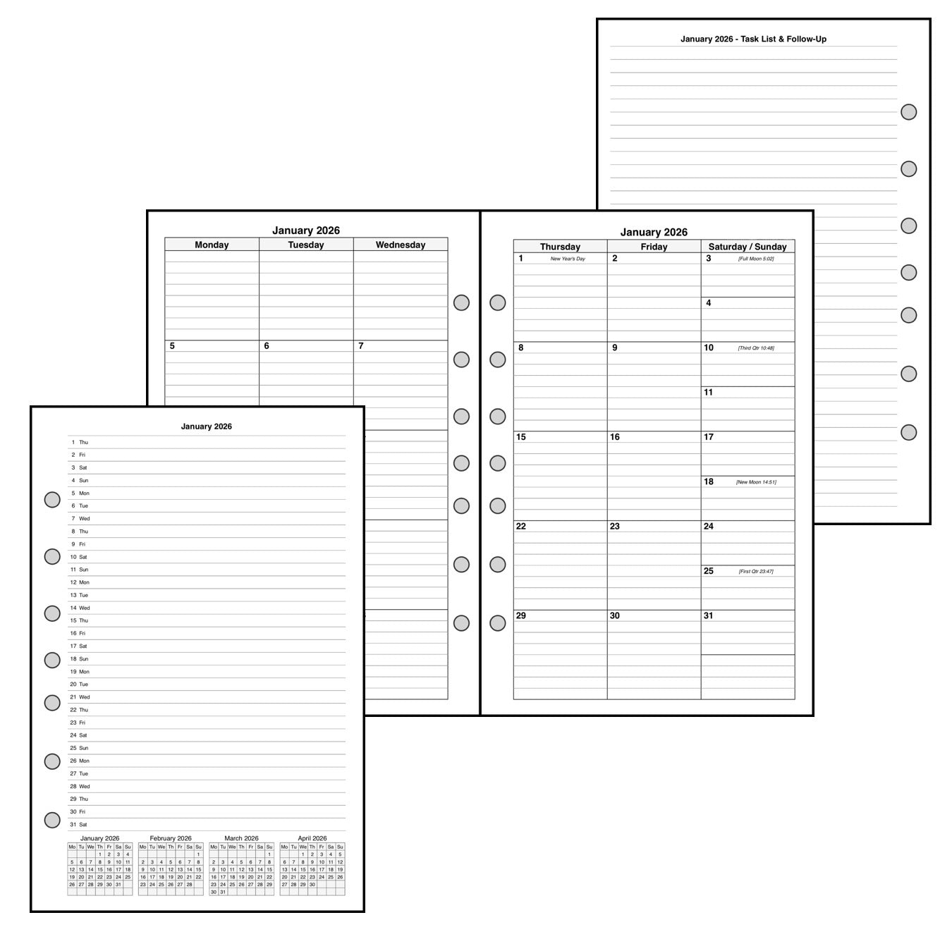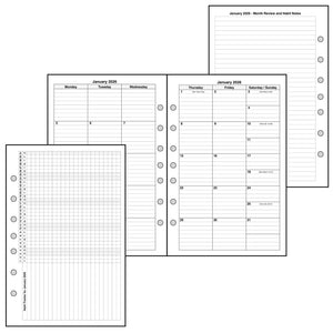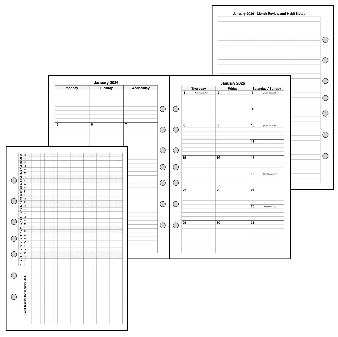 Monthly spreads can be printed back-to-back with nothing separating them, or optionally separated by notes, planning pages, or a monthly habit tracker.