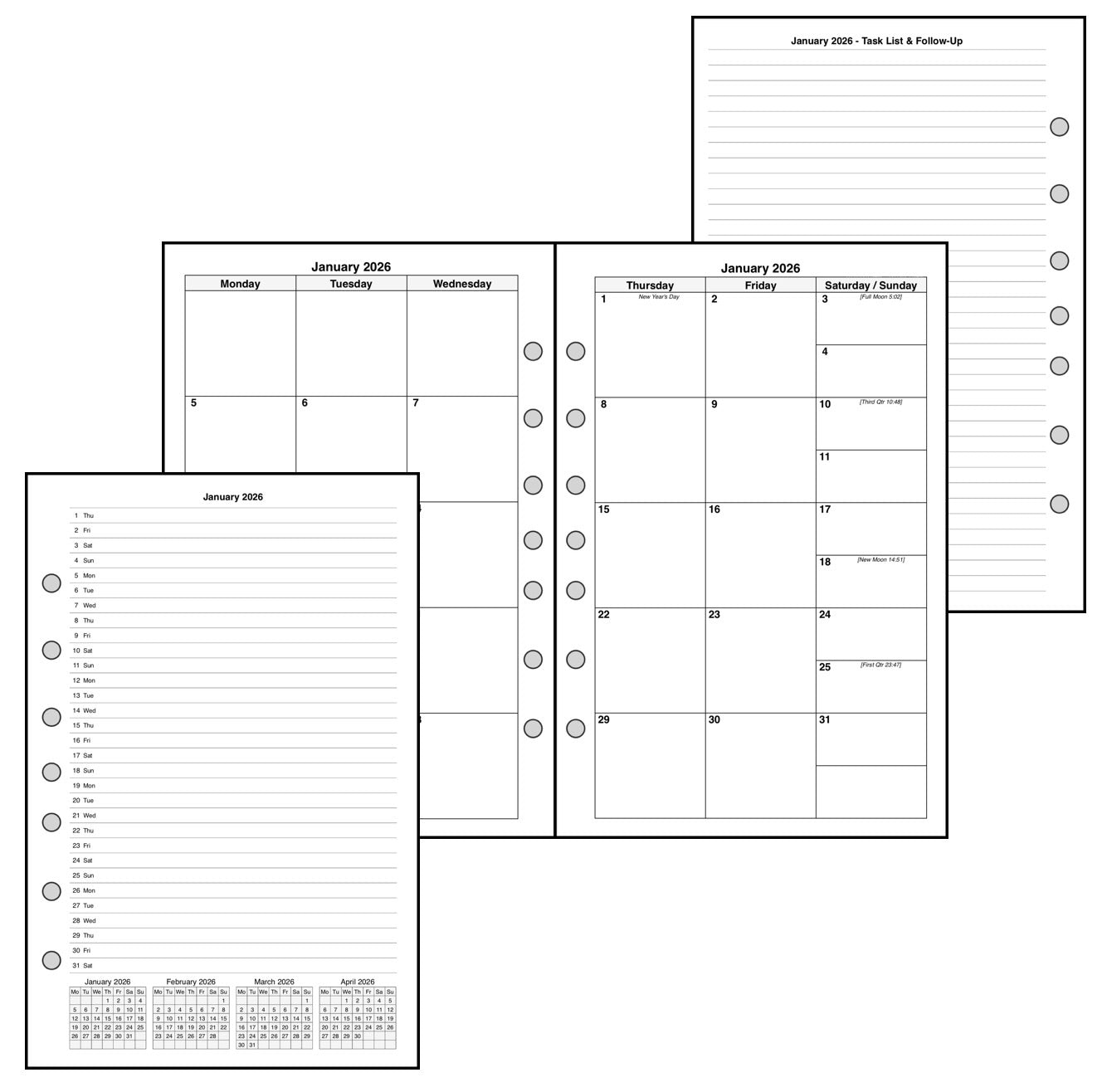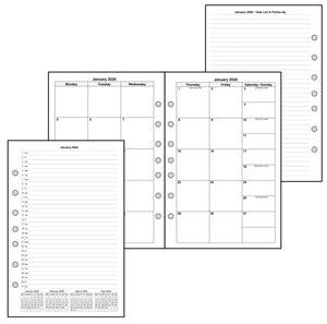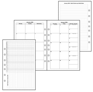 This is a monthly planner insert for the popular Classic (Half-Letter) size notebooks. Page size is Classic Half-Letter, 5½" x 8½" (140mm x 216mm). The week starts with Monday. Each month is a 2-page spread. Monday-Tuesday-Wednesday are on the left-hand page, and Thursday-Friday-Saturday/Sunday are on the right. Saturday and Sunday share the right-hand column. The daily blocks do not have lines. This is a 5 week monthly layout, so occasionally the 30th and/or the 31st would fall below the bottom row. When this happens, these dates can be either moved to the first 2 daily blocks in the first row, or these overflow days can be printed in the Monday-Tuesday blocks in the 5th week.