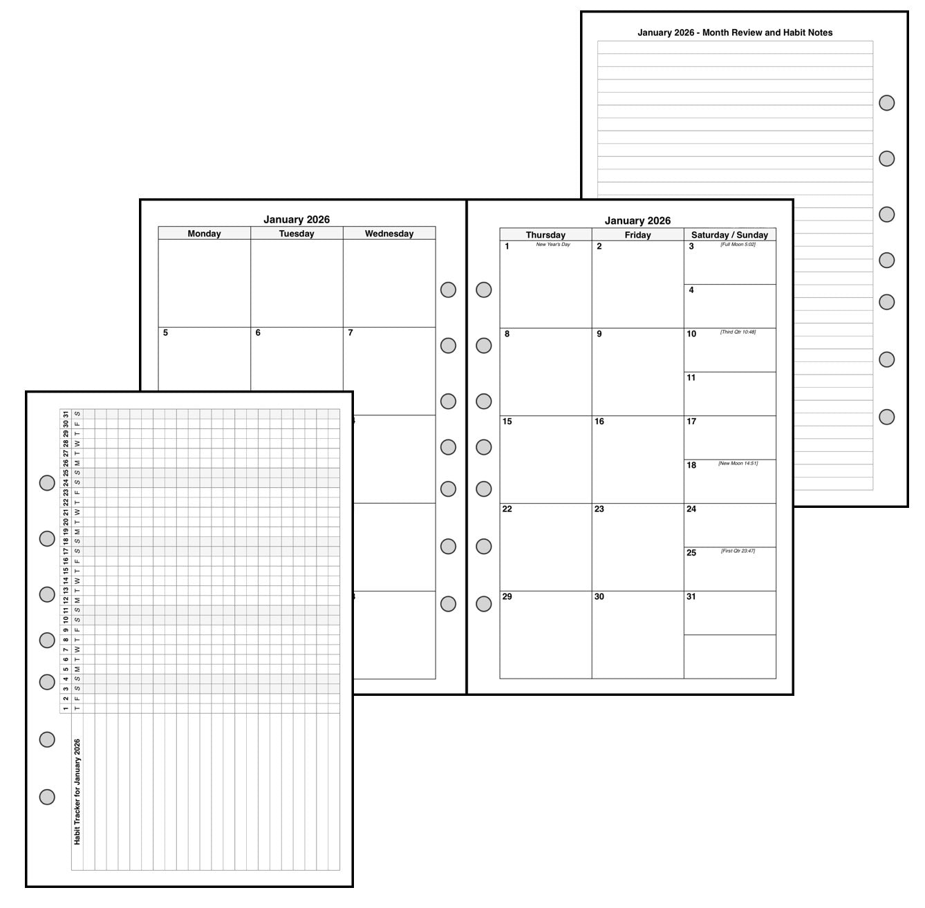 Monthly spreads can be printed back-to-back with nothing separating them, or optionally separated by notes, planning pages, or a monthly habit tracker.