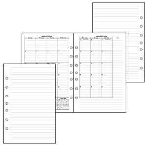 This is a monthly planner insert for Classic (Half-Letter) size notebooks. Page size is Classic Half-Letter, 5½" x 8½" (140mm x 216mm). The week start is optionally Sunday or Monday. Each month is a 2-page spread. The first 4 days of the week are on the left-hand page, and the last 3 days are on the right, plus an area for notes. Lines are printed in the daily blocks.