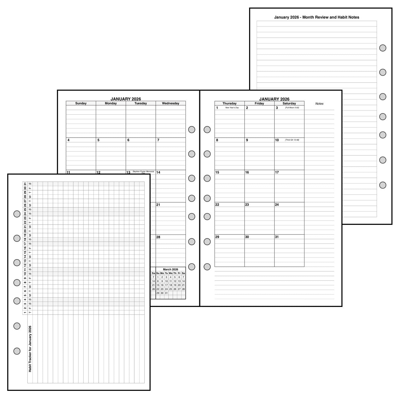 Monthly spreads can be printed back-to-back with nothing separating them, or optionally separated by notes, planning pages, or a monthly habit tracker.