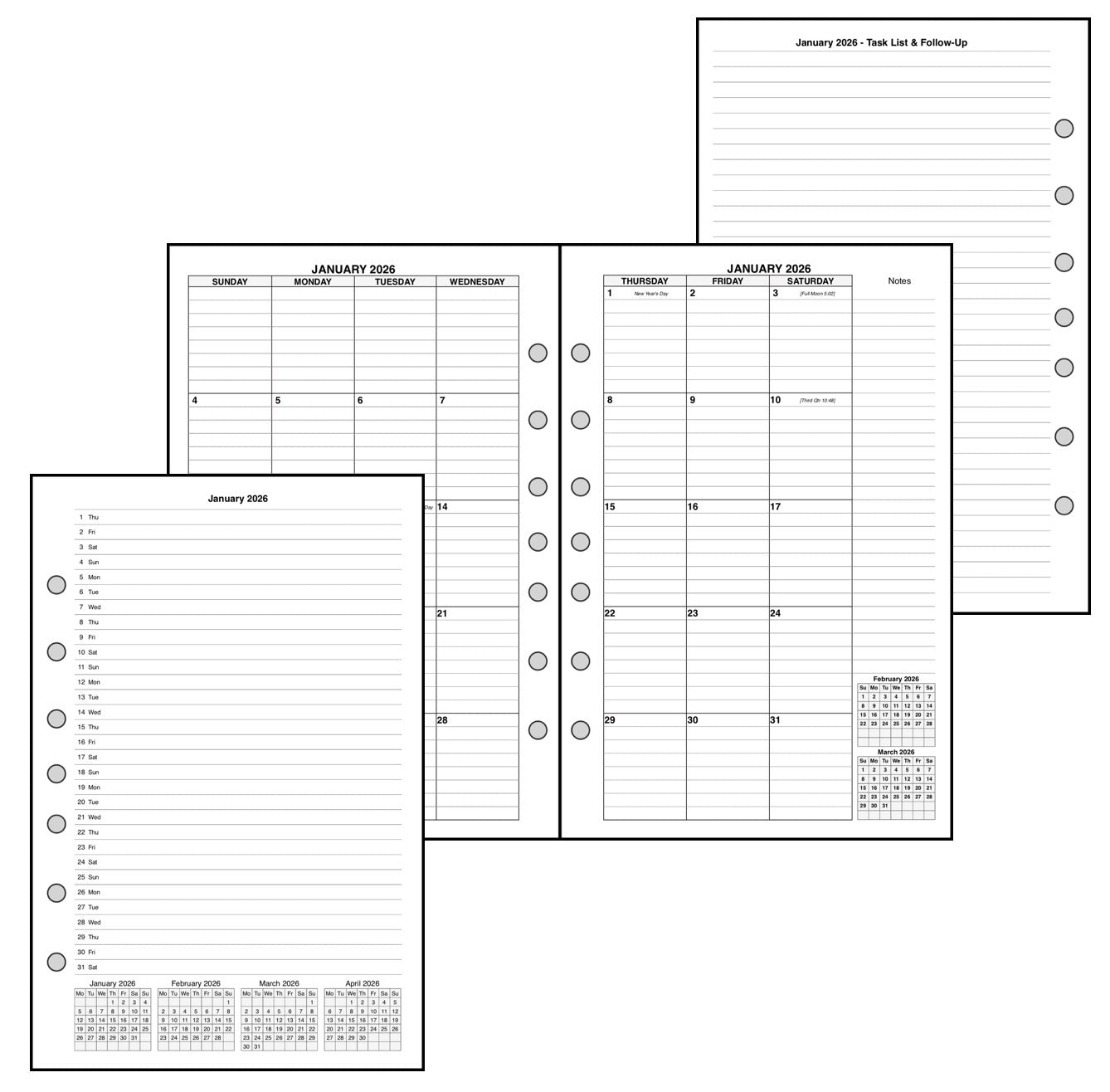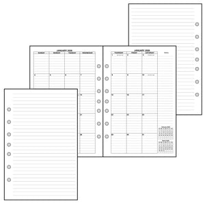 This is a monthly planner insert for Classic (Half-Letter) size notebooks. Page size is Classic Half-Letter, 5½" x 8½" (140mm x 216mm). The week start is optionally Sunday or Monday. Each month is a 2-page spread. The first 4 days of the week are on the left-hand page, and the last 3 days are on the right, plus an area for notes. Lines are printed in the daily blocks. This is a 5 week monthly layout, so occasionally the 30th and/or the 31st would fall below the bottom row. When this happens, these dates can be either moved to the first 2 daily blocks in the first row, or these overflow days can share the first 2 blocks of the 5th week.