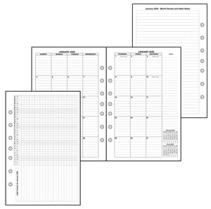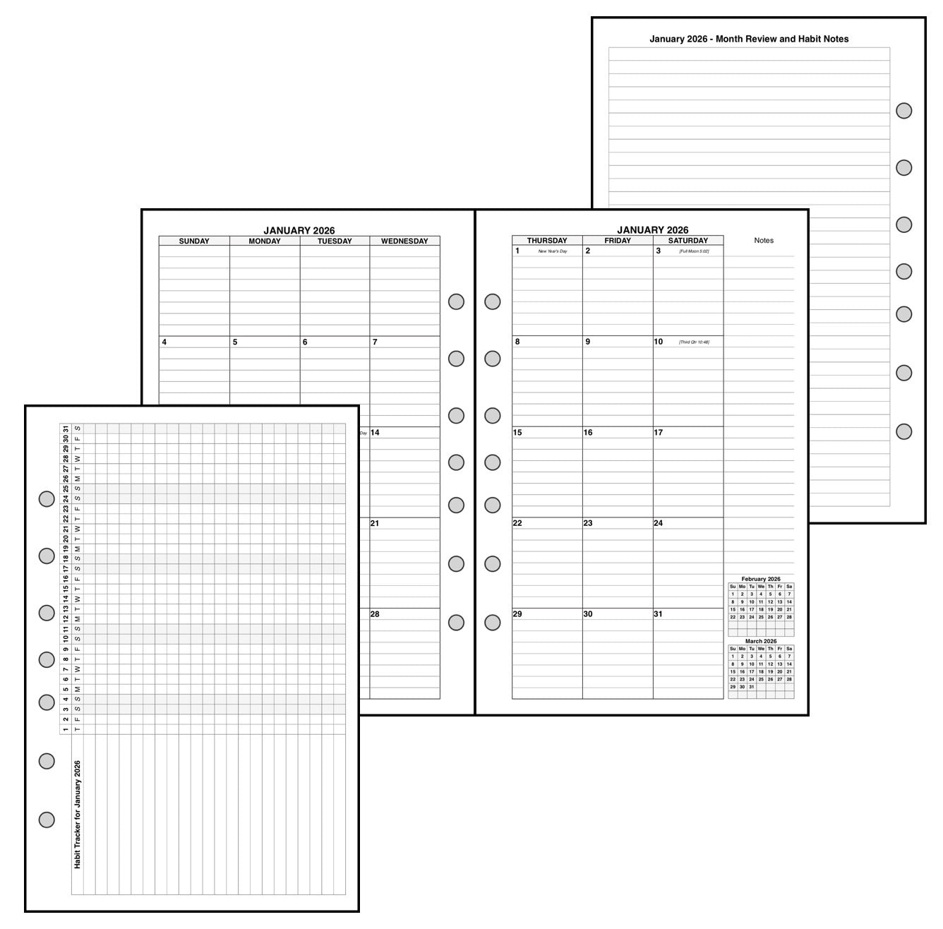 Monthly spreads can be printed back-to-back with nothing separating them, or optionally separated by notes, planning pages, or a monthly habit tracker.