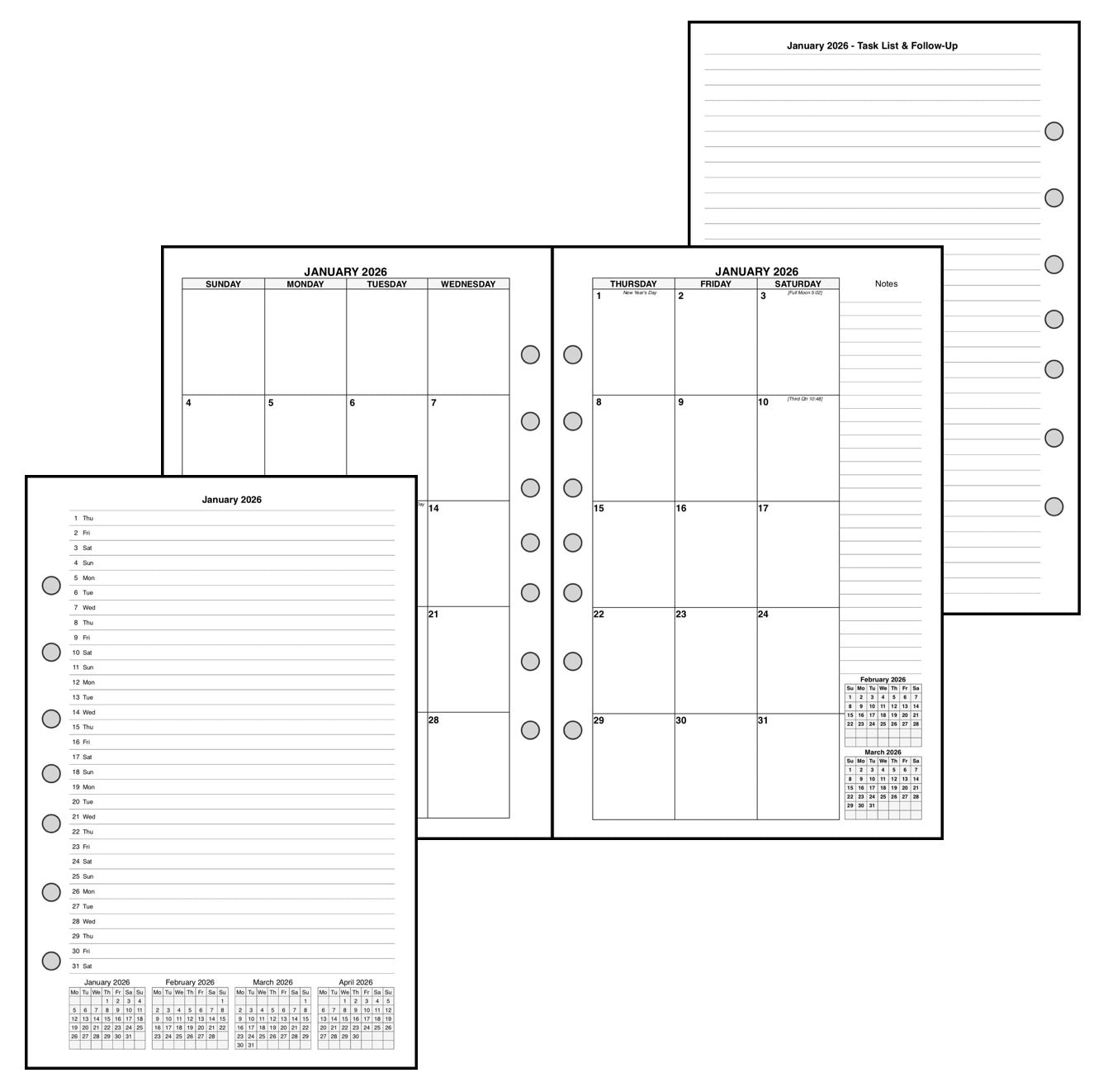 This is a monthly planner insert for Classic (Half-Letter) size notebooks. Page size is Classic Half-Letter, 5½" x 8½" (140mm x 216mm). The week start is optionally Sunday or Monday. Each month is a 2-page spread. The first 4 days of the week are on the left-hand page, and the last 3 days are on the right, plus an area for notes. The daily blocks do not have lines. This is a 5 week monthly layout, so occasionally the 30th and/or the 31st would fall below the bottom row. When this happens, these dates can be either moved to the first 2 daily blocks in the first row, or these overflow days can share the first 2 blocks in the 5th week.