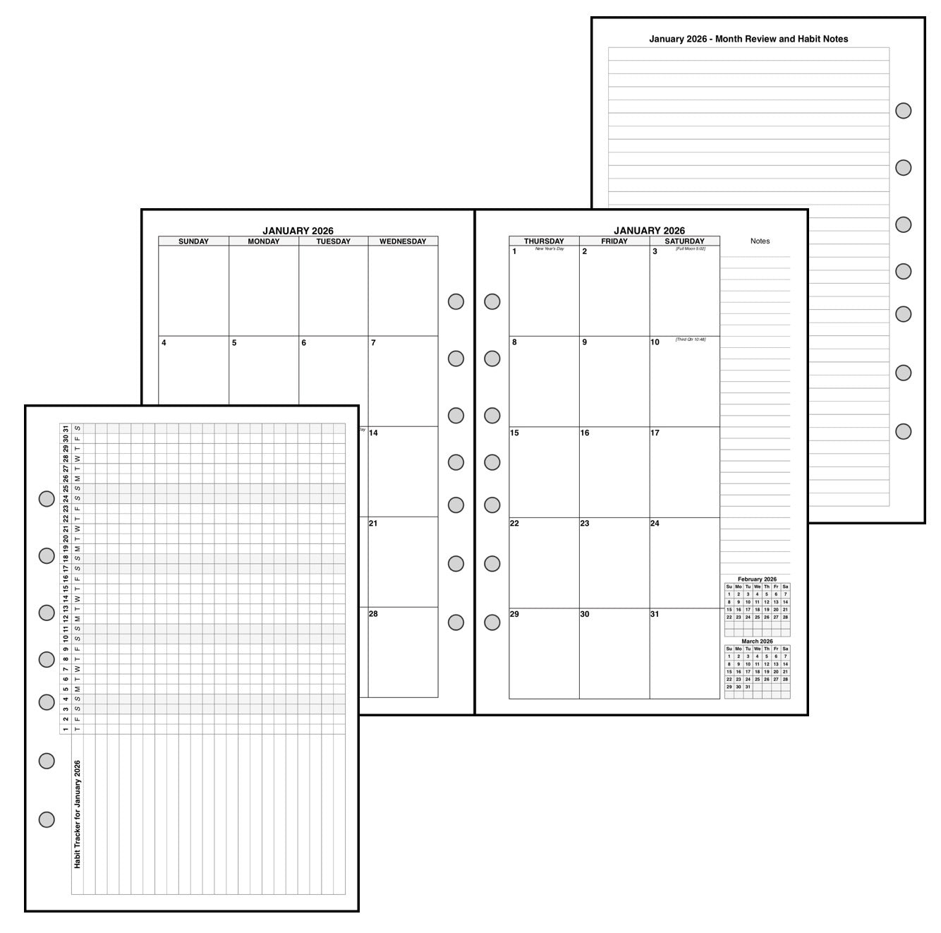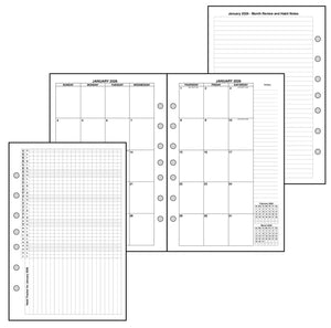 Monthly spreads can be printed back-to-back with nothing separating them, or optionally separated by notes, planning pages, or a monthly habit tracker.
