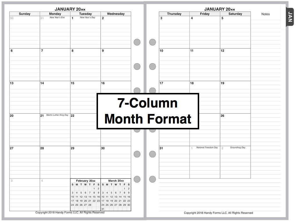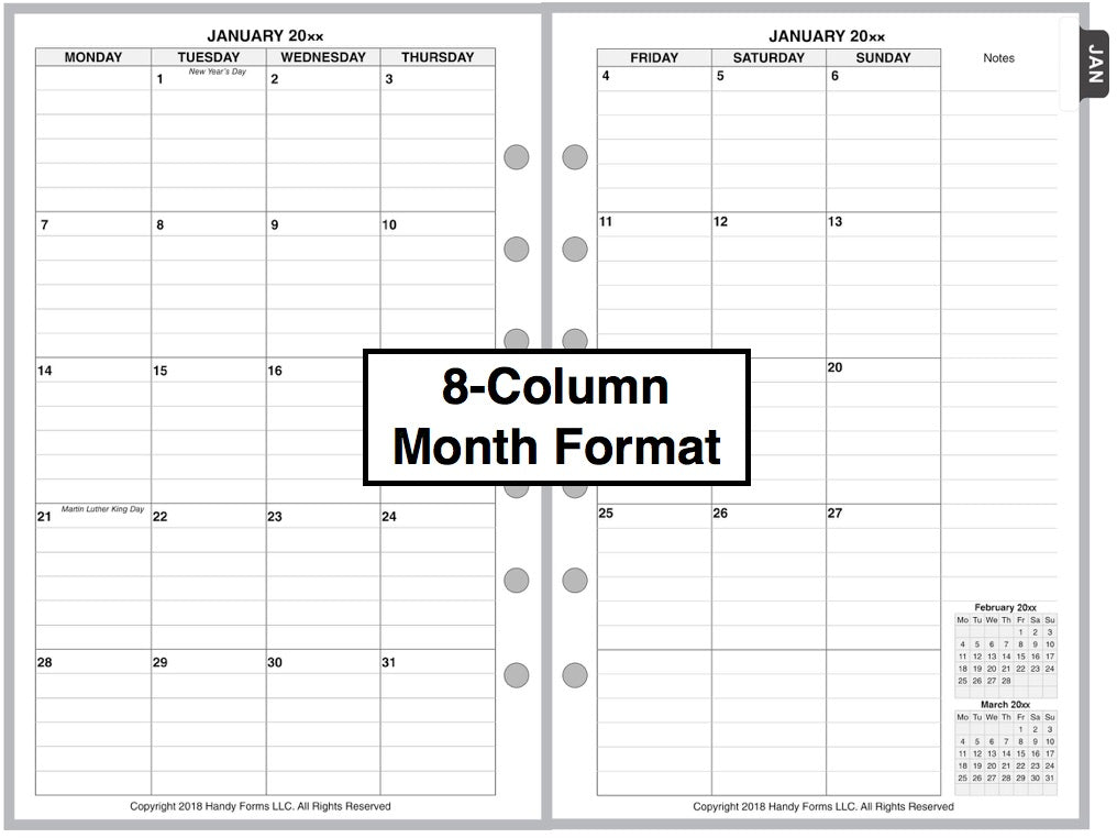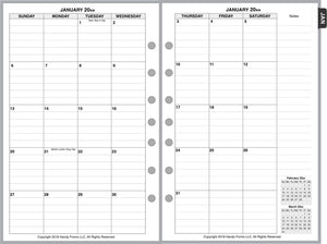 This is a daily and monthly planner insert for the popular Franklin Classic size notebooks. Page size is US half-letter standard 5½" x 8½" (140mm x 216mm). Choose the week starting day as Sunday or Monday. Each day is on one page. The hourly appointment blocks are arranged vertically in 2 columns with times from 6:00 am through 7:00 pm. The appointment time range can be changed through customization.