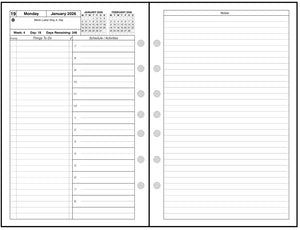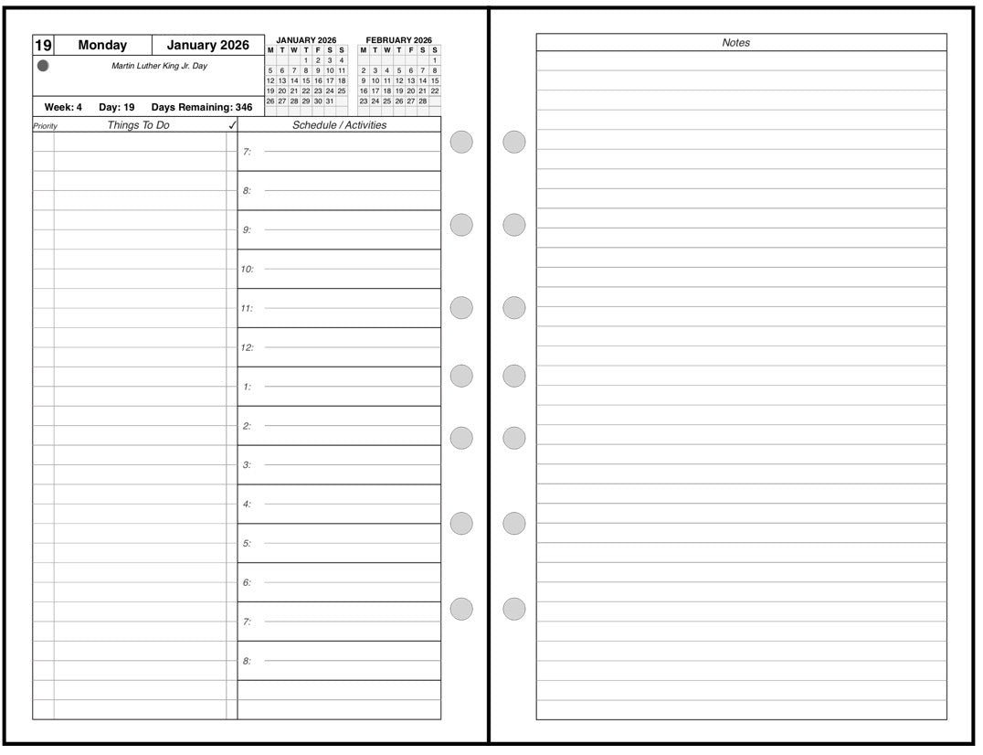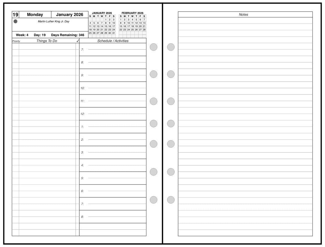 This is a daily and monthly planner insert for the popular Franklin Classic size notebooks. Page is half-letter size, 5-1/2in x 8-1/2in. Choose the week starting day as Sunday or Monday. Each day is on two pages, and months are 2-page spreads. Each daily page has appointment slots from 7:00 am to 8:00 pm. In addition there is a column for activities/schedule, and a checklist for things to do. Included are mini calendars for the current and next months.