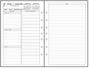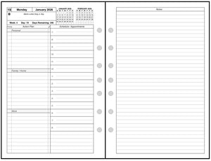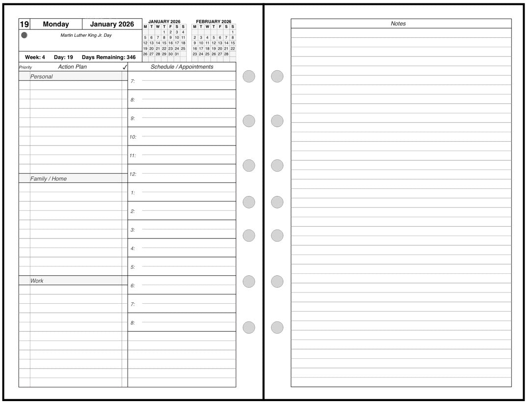 This is a daily and monthly planner insert for the popular Franklin Classic size notebooks. Page is half-letter size, 5-1/2in x 8-1/2in. Choose the week starting day as Sunday or Monday. Each day is on two pages, and months are 2-page spreads. Each daily page has appointment slots from 7:00 am to 8:00 pm. In addition there is a column for daily schedule/activities and a checklist for things to do. The daily activity section is divided into 3 subsections labeled Personal, Family / Home, and Work. The subsection names can be changed through customization. Included are mini calendars for the current and next months.