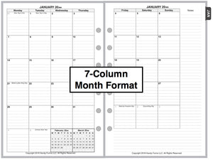 This is a daily and monthly planner insert for Franklin Classic (half-letter) size notebooks. Choose the week starting day as Sunday or Monday. Each day is on two pages, and months are 2-page spreads. Each daily page has appointment slots from 7:00 am to 8:00 pm. In addition there is a column for daily schedule/activities and a checklist for things to do. The daily activity section is divided into 3 subsections labeled Personal, Family / Home, and Work. The subsection names can be changed through customization. Included are mini calendars for the current and next months.