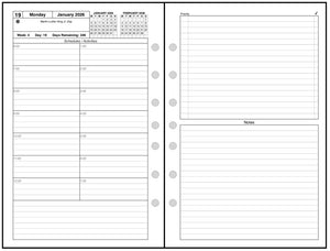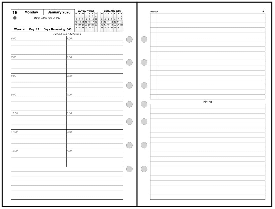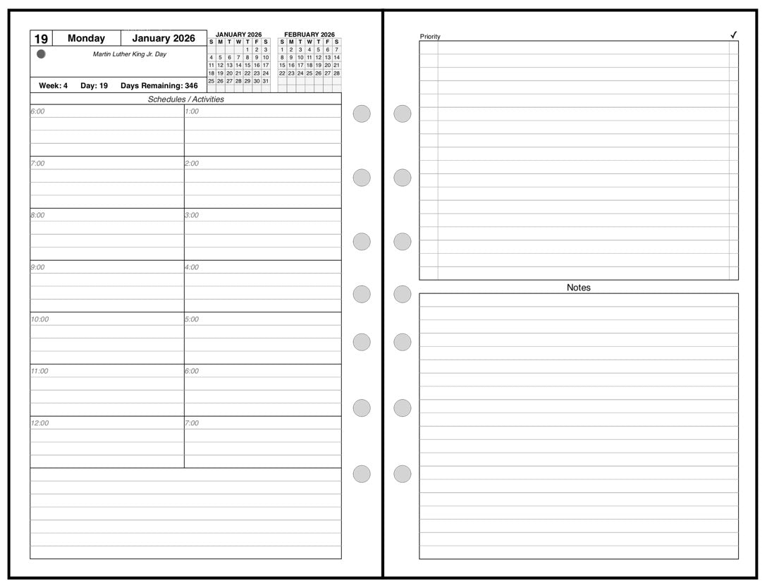 This is a daily and monthly planner insert for the popular Franklin Classic size notebooks. Page is half-letter size, 5-1/2in x 8-1/2in. Choose the week starting day as Sunday or Monday. Each day is on two pages. The hourly appointment blocks are arranged vertically in 2 columns with times from 6:00 am through 7:00 pm. The appointment time range can be changed through customization. Each appointment slot has 4 lines for detailed information. There is also a priority to do list and an area for notes.