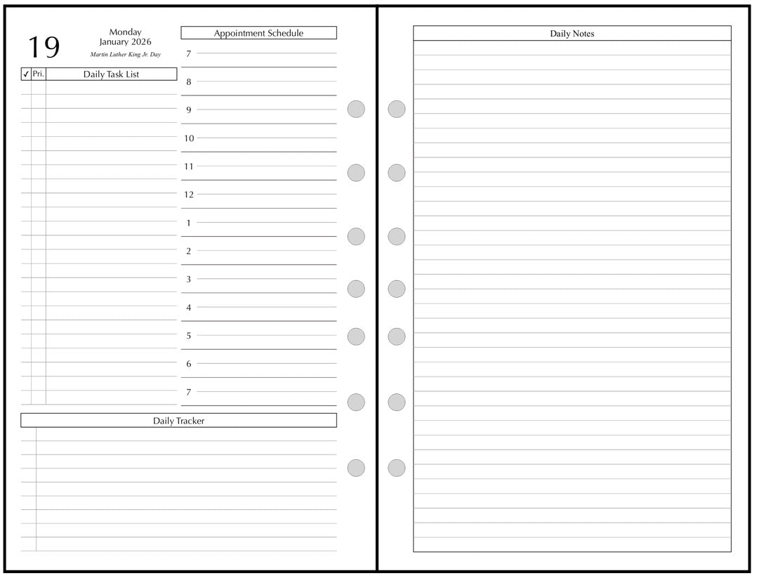 This is a daily and monthly planner insert for the popular Franklin Classic size notebooks. Page is half-letter size, 5-1/2in x 8-1/2in. Choose the week starting day as Sunday or Monday. Each day is on two pages. There is a checkmarked section for Daily Tasks, appointment times from 7:00 am to 7:00 pm, a Daily Monitor for tracking important things like expenses and messages, and a block for notes.