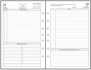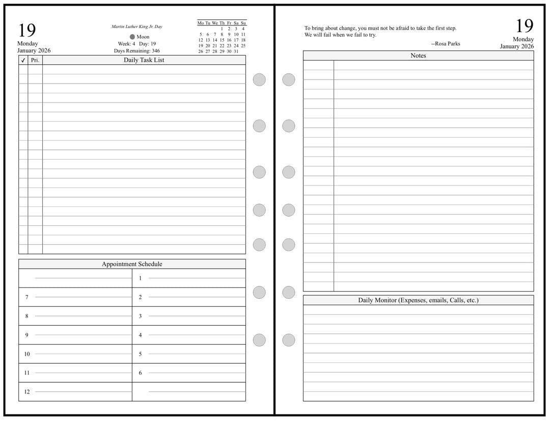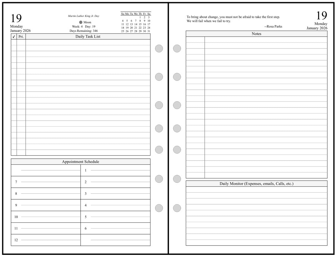 This is a daily and monthly planner insert for the popular Franklin Classic size notebooks. Page is half-letter size, 5-1/2in x 8-1/2in. Choose the week starting day as Sunday or Monday. Each day is on two pages. There is a checkmarked section for Daily Tasks with priorities, appointment times from 7:00 am to 6:00 pm, and a block for notes, and a Daily Monitor for tracking such things as expenses and messages. This planner style also includes optional, randomly selected, motivational messages.