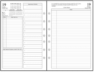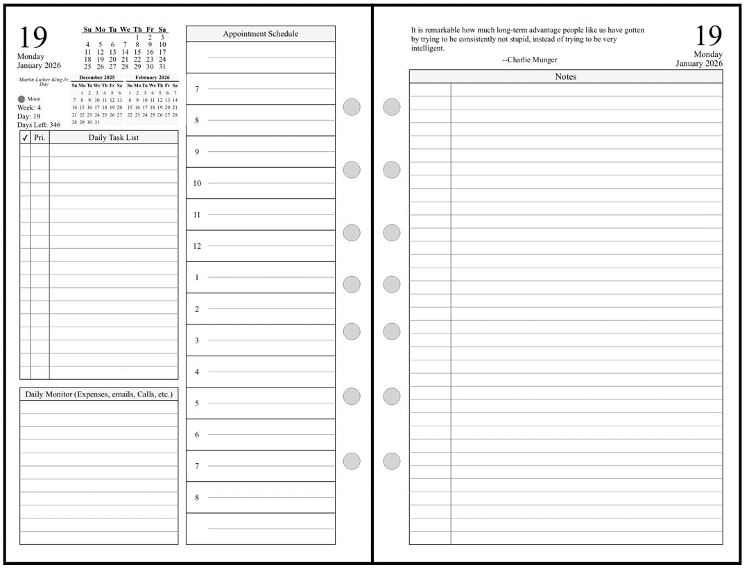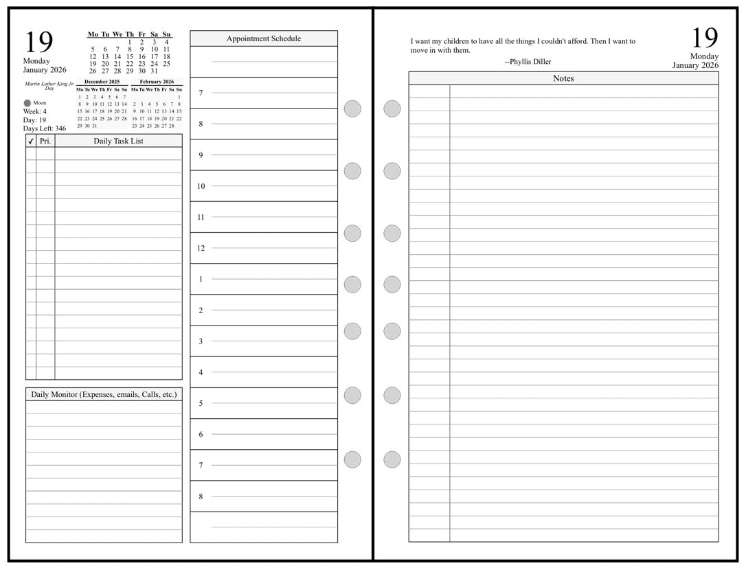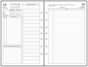 This is a daily and monthly planner insert for the popular Franklin Classic size notebooks. Page is half-letter size, 5-1/2in x 8-1/2in. Choose the week starting day as Sunday or Monday. Each day is on two pages. There is a checkmarked section for Daily Tasks, appointment times from 7:00 am to 8:00 pm, and a block for notes, and a Daily Monitor for tracking such things as expenses and messages. This planner style also includes optional, randomly selected, motivational messages.