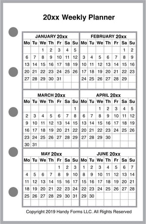 If selected, the monthly spreads are merged with the weekly pages so that the month appears immediately before the weekly pages where the first day of that month occurs. A durable plastic tab is attached to the weekly page just before the month. The monthly pages are available in 2 different formats called 6-column and 8-column. Please see the images for examples.