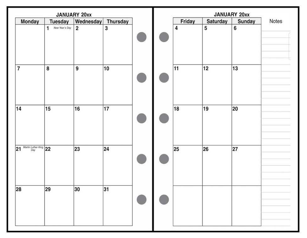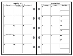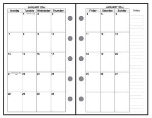 This is a weekly and monthly planner insert for Filofax Mini size notebooks. Page is Mini size, 2-3/4in x 4-3/4in. The week starts on Monday. Each week is on one page. The weekly page includes full sized blocks for Monday through Friday, with half size blocks for Saturday and Sunday at the bottom.