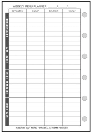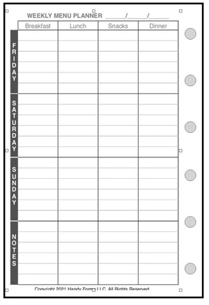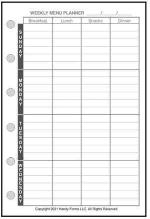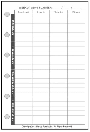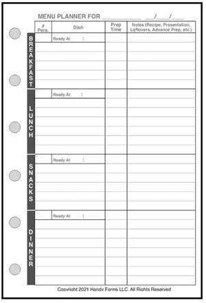 Planning meals, especially for a busy family with entertainment, school functions, work commitments, and community activities can be very challenging. What are we having for dinner next Thursday? What do I have to shop for? How many people will be at the table? This handy form for your Filofax pocket size notebooks. planner can help. It combines 3 different forms: (1) a weekly meal planner for each day, including breakfast, lunch, snacks (or hors d'oeurves), and dinner; (2) a daily meal planner for breakfast, lunch, snacks, and dinner, including the number of people, the time it has to be ready, each dish planned, the preparation time, plus special notes about the recipe, presentation, left overs, advanced prep, etc.; and (3) a shopping list form separating items by store, date, and department, providing a check-off for items purchased.
