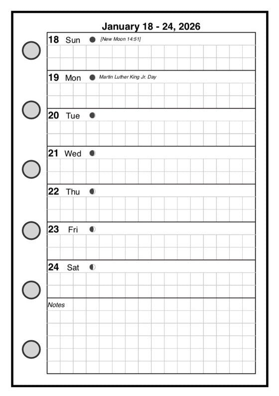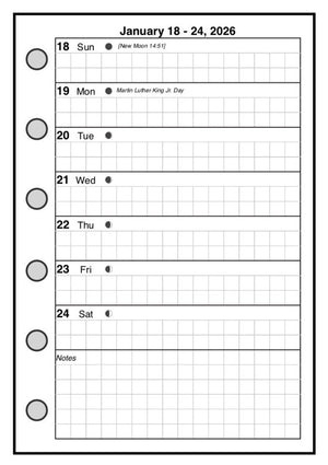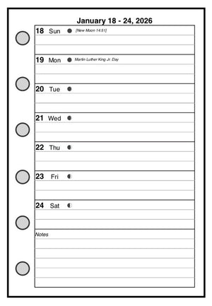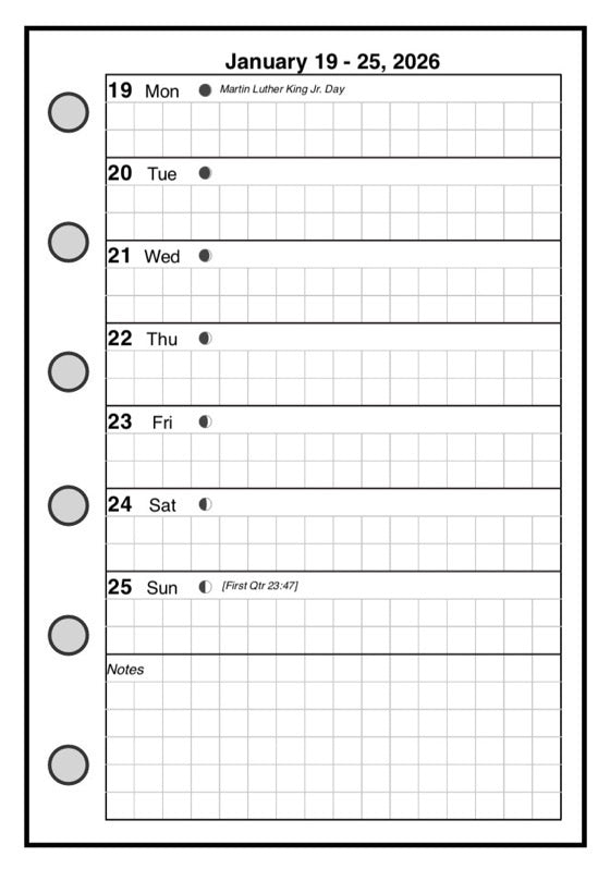 This is a weekly & monthly planner insert for Filofax Pocket size notebooks. Page is Filofax Pocket size, 3¼" x 4¾". Choose the week start day as Sunday or Monday. The days of the week are equal size blocks. Across the bottom of the page is a block for notes.