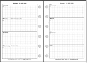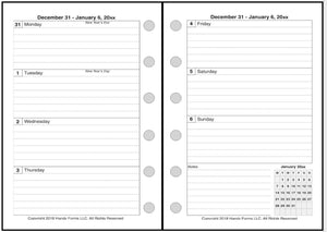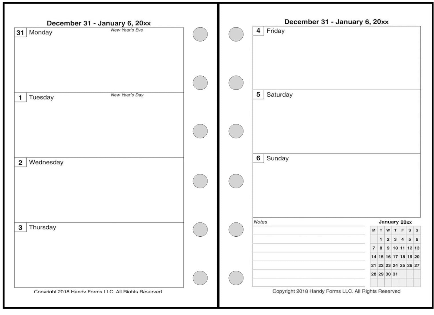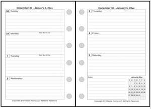 This is a weekly & monthly planner insert for Pocket size notebooks. Page is Pocket size, 3-1/4in x 4-3/4in. Each week is on 2 pages. Choose the week start day as Sunday or Monday. The first 4 days of the week are on the left, and the last 3 are on the right, plus space for notes and a mini reference calendar of the current month.