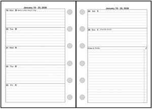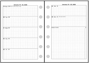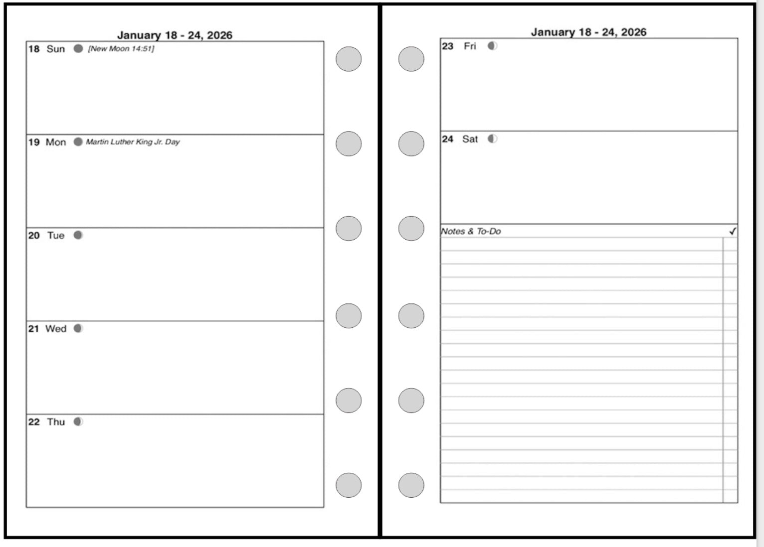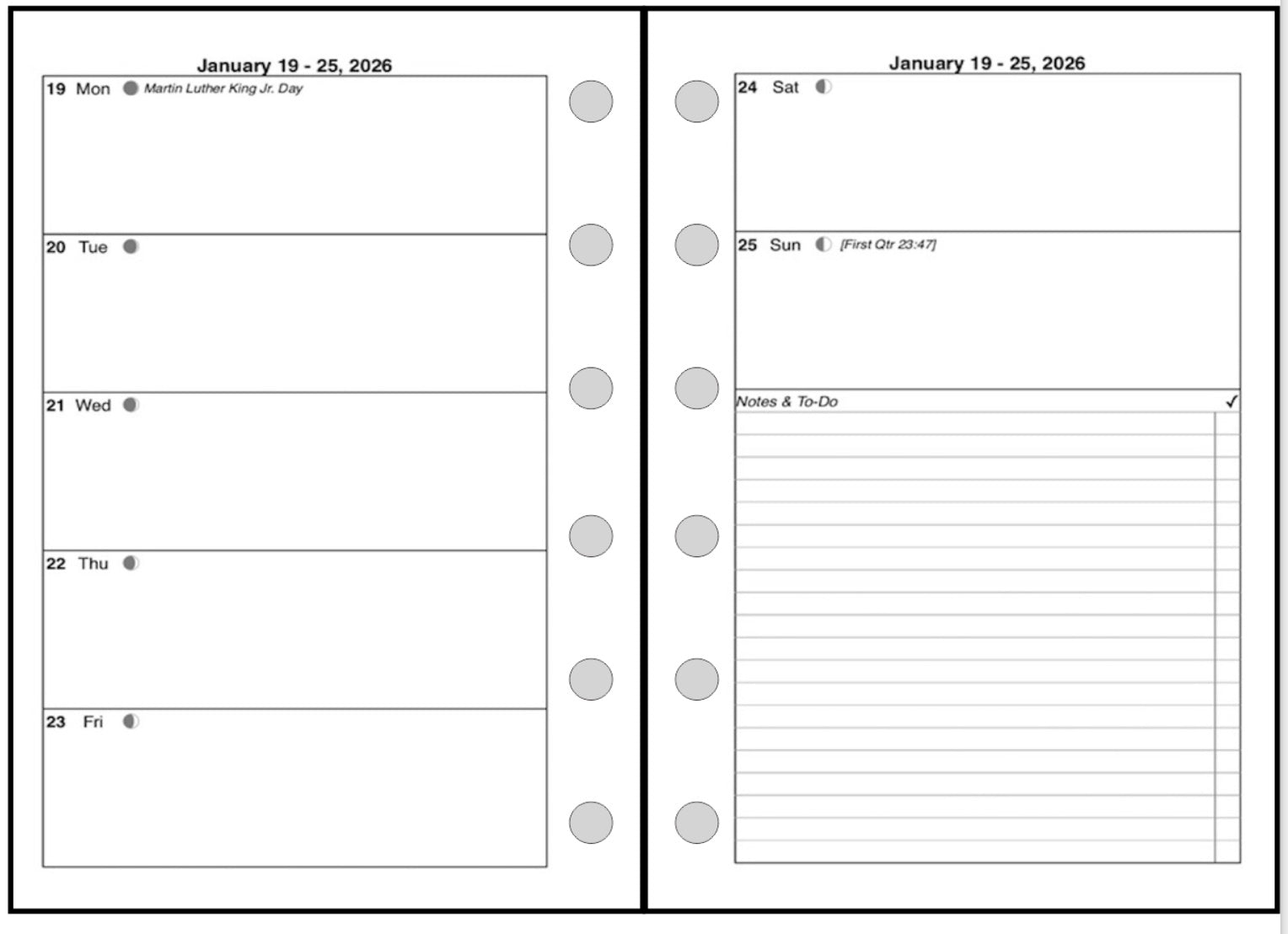 This is a weekly & monthly planner insert for Pocket size notebooks. Page is Pocket size, 3-1/4in x 4-3/4in. Choose the week start day as Sunday or Monday. Each week is a 2-page spread. The first 5 days of the week on the left, the last 2 on the right. On the right there are sections for a weekly To-Do list and notes.