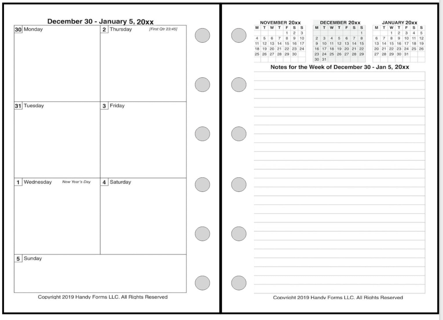 This is a weekly & monthly planner insert for Pocket size notebooks. Page is Pocket size, 3-1/4in x 4-3/4in. Choose the week start day as Sunday or Monday. Each week is a 2-page spread. The days of the week are on the left. The first 6 days of the week are arranged in 2 columns, 3 days on the left and 3 on the right. The 7th day spans across the bottom. On the right is a note page which includes mini-reference monthly calendars showing the previous, current, and following months.