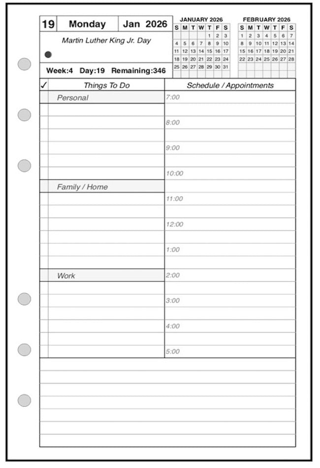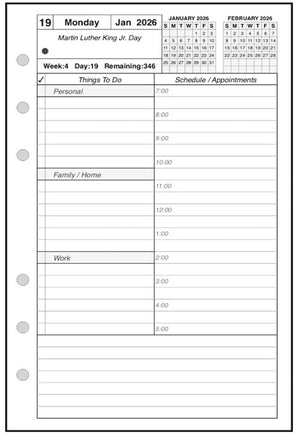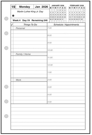 This is a daily and monthly planner insert for Filofax pocket size notebooks. Page is Pocket size, 3-1/4in x 4-3/4in. Choose the week starting day as Sunday or Monday. Each day is on one page, and months are 2-page spreads. Each daily page has appointment slots from 7:00 am to 8:00 pm. In addition there is a column for daily activities and a checklist for things to do. The daily activity section is divided into 3 subsections labeled Personal, Family / Home, and Work. The subsection names can be changed through customization. Included are mini calendars for the current and next months.