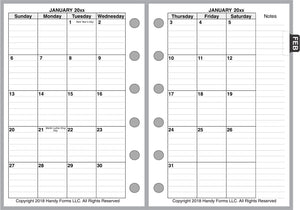 This is a daily and monthly planner insert for the popular Pocket size size notebooks. Page size is Filofax Pocket 3¼" x 4¾" (83mm x 121mm). The week starts on Sunday or Monday. Each day is on one page. The page provides appointment time slots from 6:00 am to 7:00 pm plus space for general notes. Also included are 1-page yearly calendars for the current year and next year.