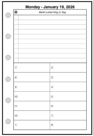 This is a daily and monthly planner insert for Filofax pocket size notebooks. Page is Pocket size, 3-1/4in x 4-3/4in. The week starts on Sunday or Monday. Each day is on one page. The page provides appointment time slots from 6:00 am to 7:00 pm plus space for general notes. Also included are 1-page yearly calendars for the current year and next year.