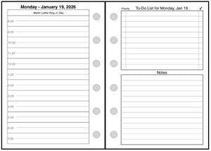 This is a daily and monthly planner insert for Filofax pocket size notebooks. Page is Pocket size, 3-1/4in x 4-3/4in. The week starts on Sunday or Monday. Each day is on two pages. The page provides appointment time slots from 7:00 am to 8:00 pm plus space for general notes. Also included are 1-page yearly calendars for the current year and next year.