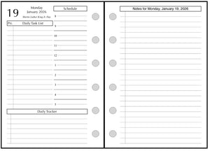 This is a daily and monthly planner insert for Filofax pocket size notebooks. Page is Pocket size, 3-1/4in x 4-3/4in. Choose the week starting day as Sunday or Monday. Each day is on two pages. There is a checkmarked section for Daily Tasks, appointment times from 7:00 am to 7:00 pm, a Daily Monitor for tracking important things like expenses and messages, and a block for notes.
