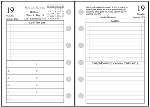 This is a daily and monthly planner insert for Filofax pocket size notebooks. Page is Pocket size, 3-1/4in x 4-3/4in. Choose the week starting day as Sunday or Monday. Each day is on two pages. There is a checkmarked section for Daily Tasks with priorities, appointment times from 8:00 am to 5:00 pm plus 2 blank slots, and a block for notes, and a Daily Monitor for tracking such things as expenses and messages. This planner style also includes optional, randomly selected, motivational messages.
