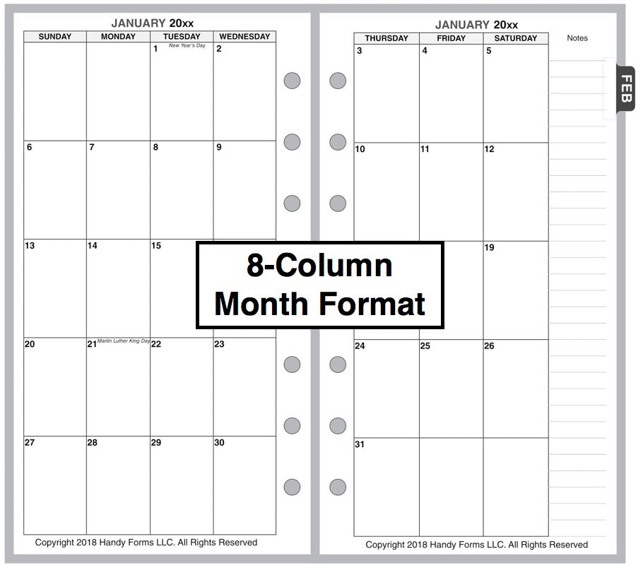 If selected, the monthly spreads are merged with the weekly pages so that the month appears immediately before the weekly pages where the first day of that month occurs. A durable plastic tab is attached to the weekly page just before the month. The monthly pages are available in 3 different formats called 6-column, 7-column, and 8-column. Please see the images for examples.