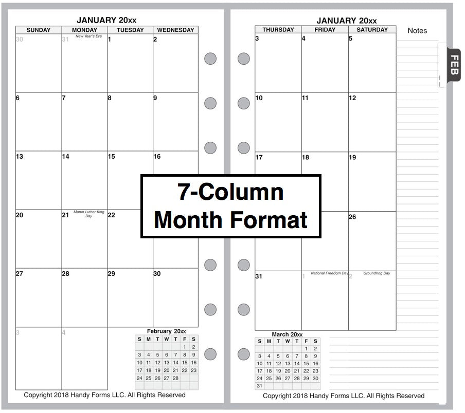 If selected, the monthly spreads are merged with the weekly pages so that the month appears immediately before the weekly pages where the first day of that month occurs. A durable plastic tab is attached to the weekly page just before the month. The monthly pages are available in 3 different formats called 6-column, 7-column, and 8-column. Please see the images for examples.