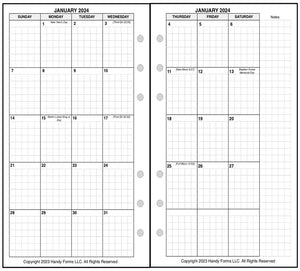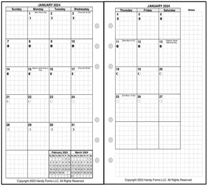 This is a weekly & monthly planner insert for Filofax Personal size notebook. Page is Personal size, 3-3/4in x 6-3/4in. Choose the week start day as Sunday or Monday. Each week is a 2-page spread. The first 5 days of the week on the left, the last 2 on the right. On the right there are sections for a weekly To-Do list and notes.