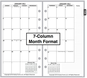 If selected, the monthly spreads are merged with the weekly pages so that the month appears immediately before the weekly pages where the first day of that month occurs. A durable plastic tab is attached to the weekly page just before the month. The monthly pages are available in 3 different formats called 6-column, 7-column, and 8-column. Please see the images for examples.