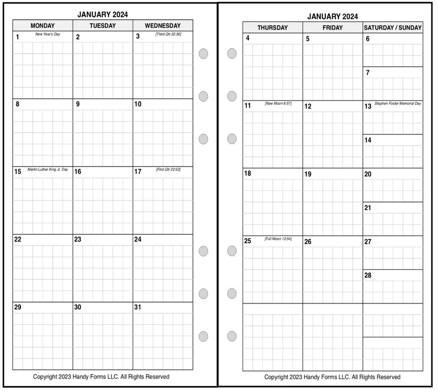 If selected, the monthly spreads are merged with the weekly pages so that the month appears immediately before the weekly pages where the first day of that month occurs. A durable plastic tab is attached to the weekly page just before the month. The monthly pages are available in 3 different formats called 6-column, 7-column, and 8-column. Please see the images for examples.