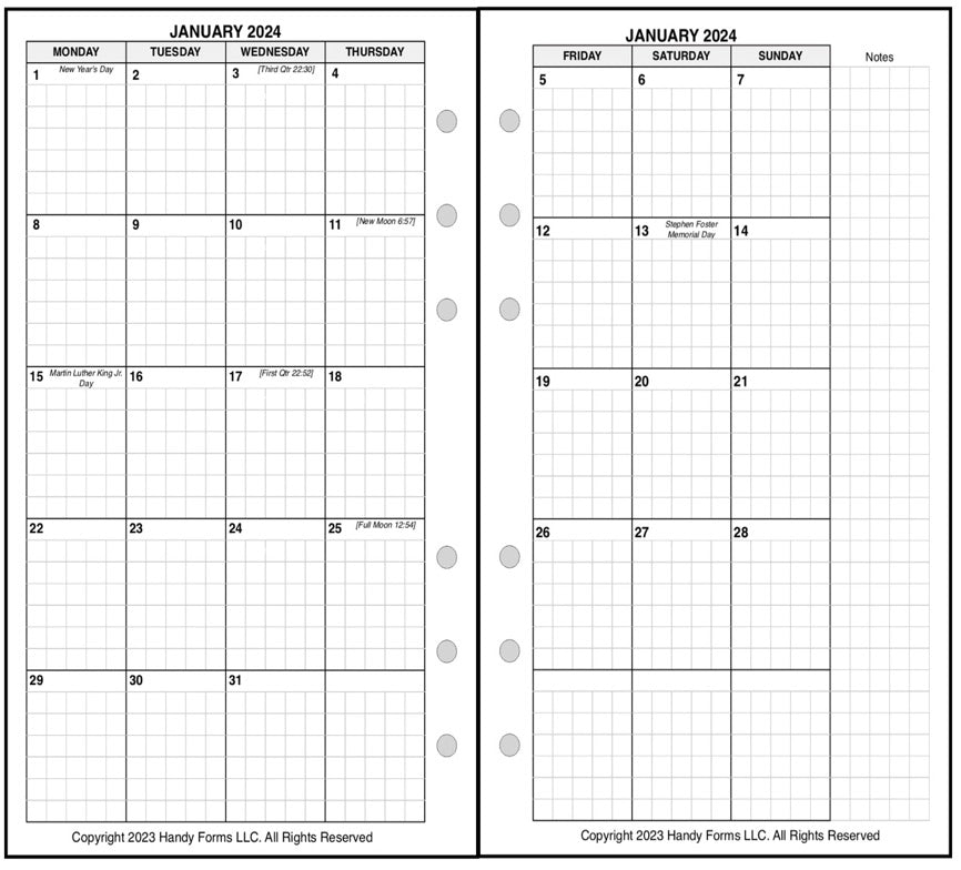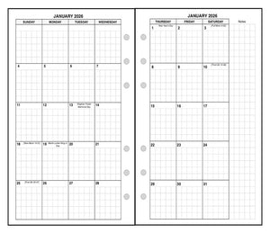 This is a weekly & monthly planner insert for Filofax Personal size notebook. Page is Personal size, 3-3/4in x 6-3/4in. Choose the week start day as Sunday or Monday. Each week is a 2-page spread. The days of the week are on the left. On the right is a note page which includes mini-reference monthly calendars showing the previous, current, and following months.