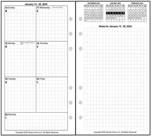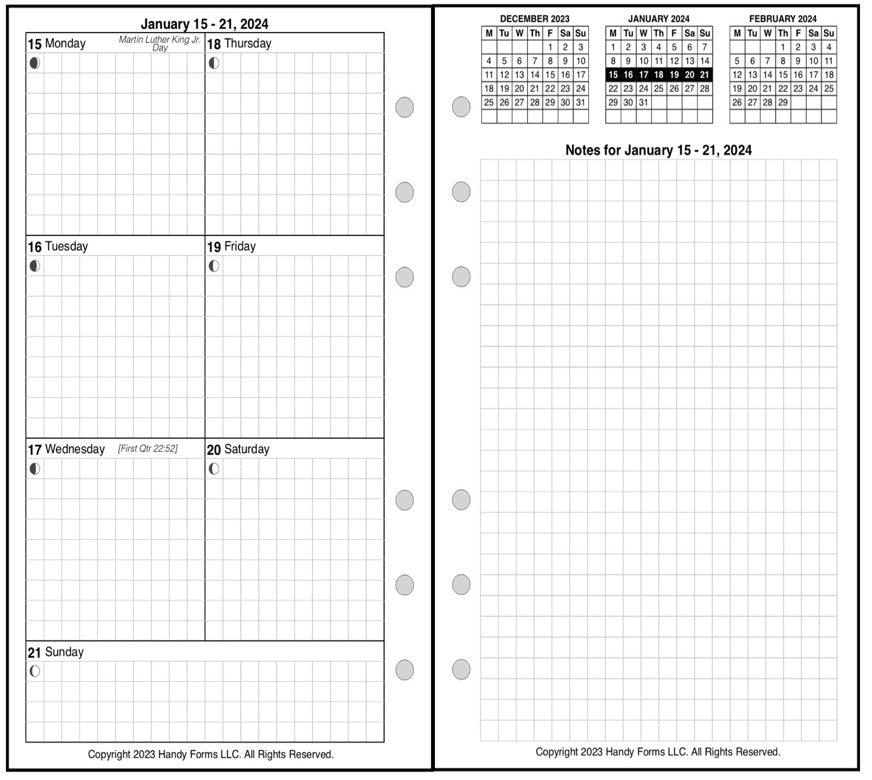 This is a weekly & monthly planner insert for Filofax Personal size notebook. Page is Personal size, 3-3/4in x 6-3/4in. Choose the week start day as Sunday or Monday. Each week is a 2-page spread. The days of the week are on the left. The first 6 days of the week are arranged in 2 columns, 3 days on the left and 3 on the right. The 7th day spans across the bottom. On the right is a note page which includes mini-reference monthly calendars showing the previous, current, and following months.