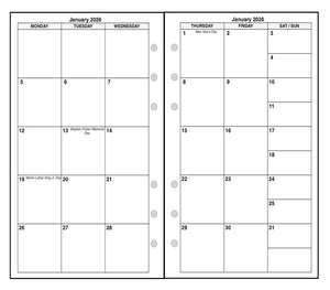 If selected, the monthly spreads are merged with the weekly pages so that the month appears immediately before the weekly pages where the first day of that month occurs. A durable plastic tab is attached to the weekly page just before the month. The monthly pages are available in 3 different formats called 6-column, 7-column, and 8-column. Please see the images for examples.