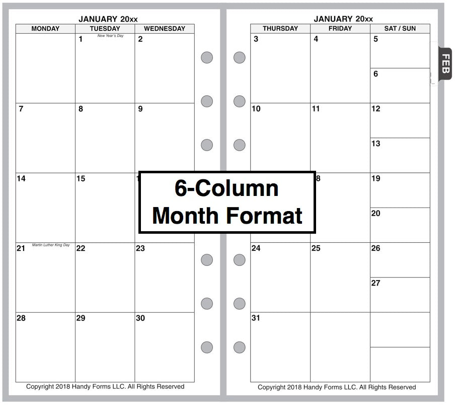 If selected, the monthly spreads are merged with the weekly pages so that the month appears immediately before the weekly pages where the first day of that month occurs. A durable plastic tab is attached to the weekly page just before the month. The monthly pages are available in 3 different formats called 6-column, 7-column, and 8-column. Please see the images for examples.