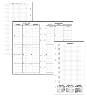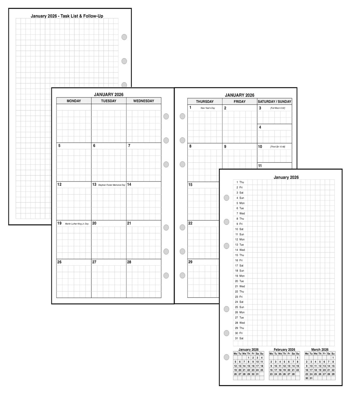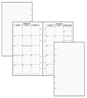 This is a monthly planner insert for Personal size notebooks. Page size is Personal, 3¾" x 6¾" (95mm x 171mm). The week starts with Monday. Each month is a 2-page spread. Monday-Tuesday-Wednesday are on the left-hand page, and Thursday-Friday-Saturday/Sunday are on the right. Saturday and Sunday share the right-hand column. A grid is printed in the daily blocks. This is a 5 week monthly layout, so occasionally the 30th and/or the 31st would fall below the bottom row. When this happens, these dates can be either moved to the first 2 daily blocks in the first row, or these overflow days can be printed in the Monday-Tuesday blocks in the 5th week.