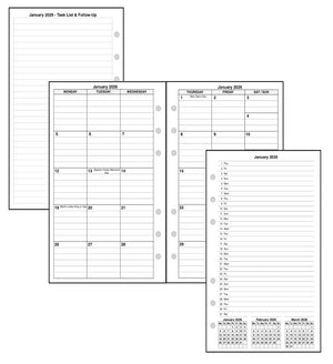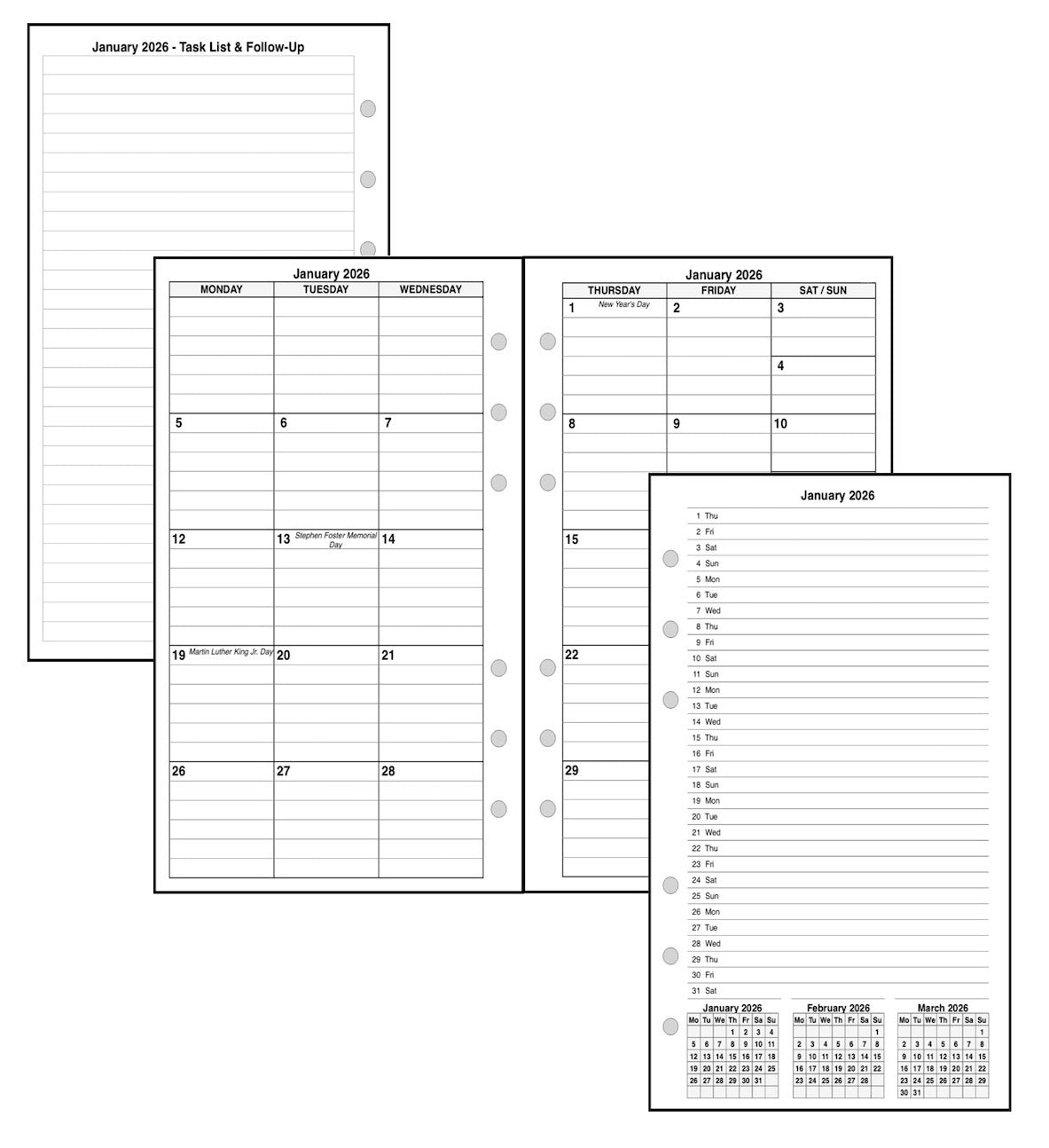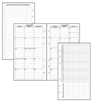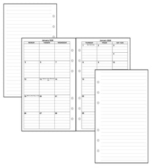 This is a monthly planner insert for Personal size notebooks. Page size is Personal, 3¾" x 6¾" (95mm x 171mm). The week starts with Monday. Each month is a 2-page spread. Monday-Tuesday-Wednesday are on the left-hand page, and Thursday-Friday-Saturday/Sunday are on the right. Saturday and Sunday share the right-hand column. Lines are printed in the daily blocks. This is a 5 week monthly layout, so occasionally the 30th and/or the 31st would fall below the bottom row. When this happens, these dates can be either moved to the first 2 daily blocks in the first row, or these overflow days can be printed in the Monday-Tuesday blocks in the 5th week.