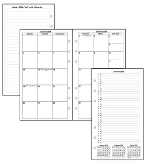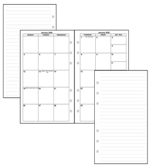 This is a monthly planner insert for the popular Personal size notebooks. Page size is Personal, 3¾" x 6¾" (95mm x 171mm). The week starts with Monday. Each month is a 2-page spread. Monday-Tuesday-Wednesday are on the left-hand page, and Thursday-Friday-Saturday/Sunday are on the right. Saturday and Sunday share the right-hand column. The daily blocks do not have lines. This is a 5 week monthly layout, so occasionally the 30th and/or the 31st would fall below the bottom row. When this happens, these dates can be either moved to the first 2 daily blocks in the first row, or these overflow days can be printed in the Monday-Tuesday blocks in the 5th week.